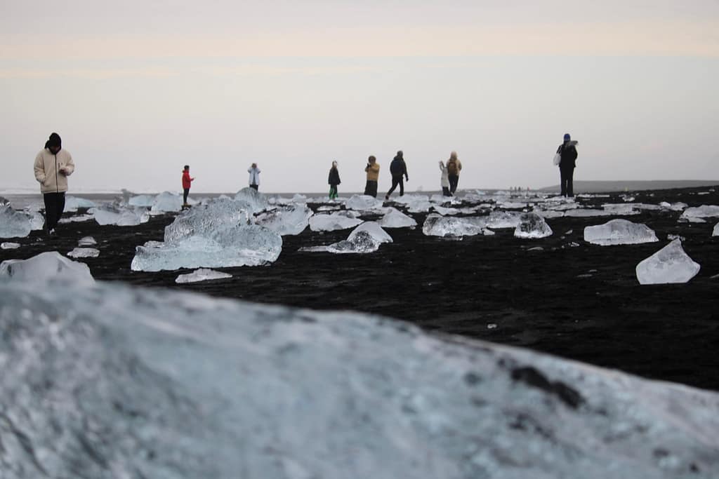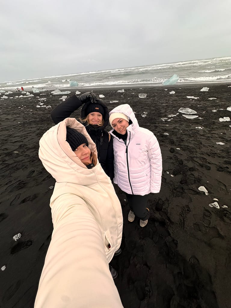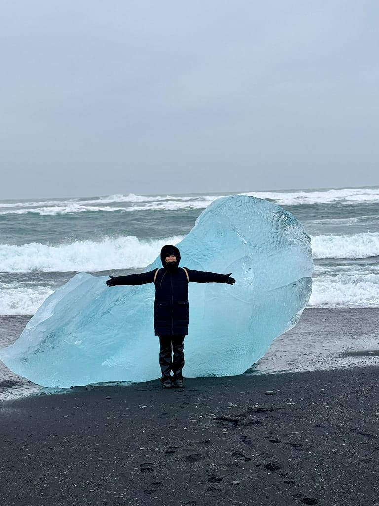 We woke up early for a road trip to Diamond Beach—about a five-hour drive from Reykjavik. It actually took us six hours with stops. The black volcanic sand covered in ice chunks looked like scattered diamonds, absolutely breathtaking. Right across the road is Jökulsárlón Glacier Lagoon, where we spotted seals floating on the icebergs. You can also take a boat trip here, though we skipped it.