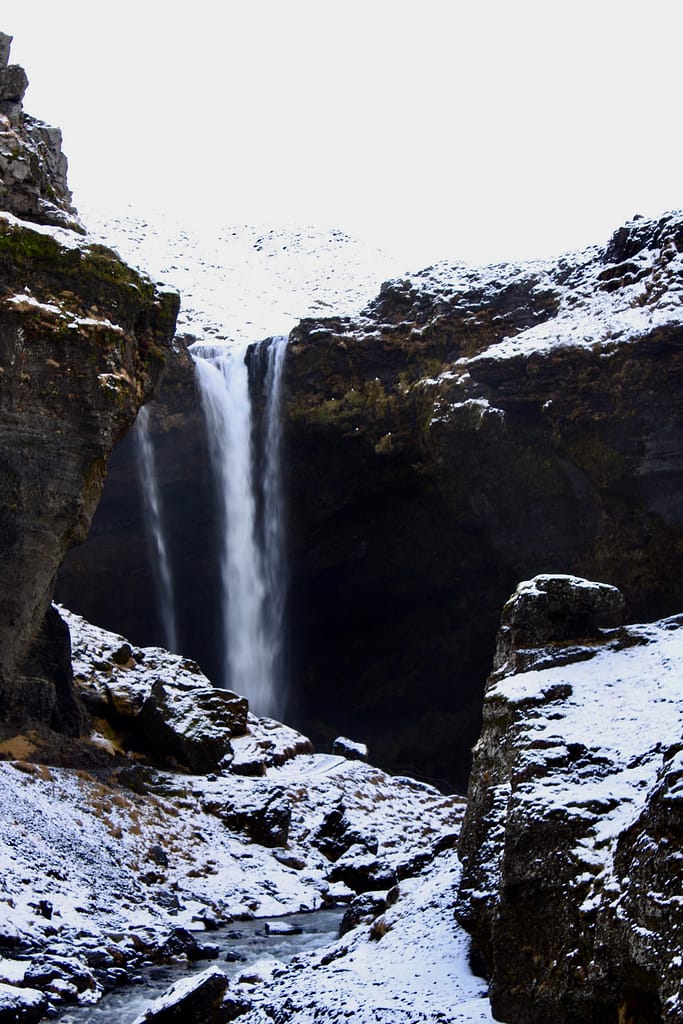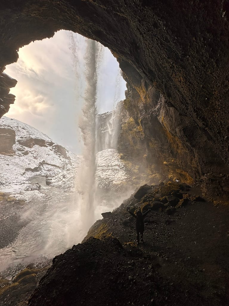 With better weather, we set off to explore Iceland’s famous waterfalls. First stop: Kvernufoss, a hidden gem just a 10-minute walk from the parking area. You can walk behind it for an epic view.