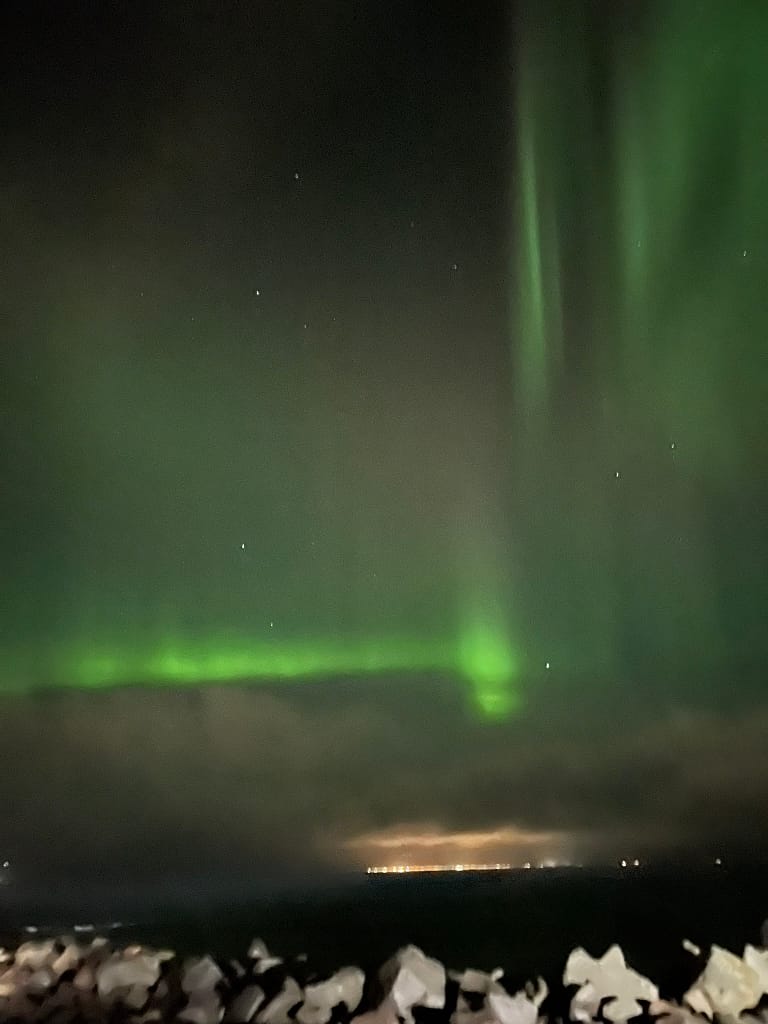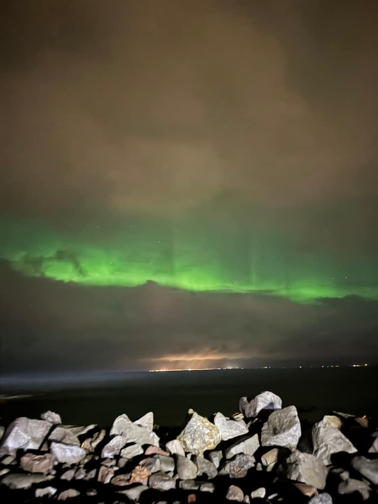 That night, we went hunting for the Northern Lights. The forecast was good, but clouds covered the sky. A waiter at Islenski Barinn tipped us off about the lighthouse being the best viewing spot, and luckily, we caught a glimpse of the magical green lights! Not the brightest display, but still an unforgettable moment.