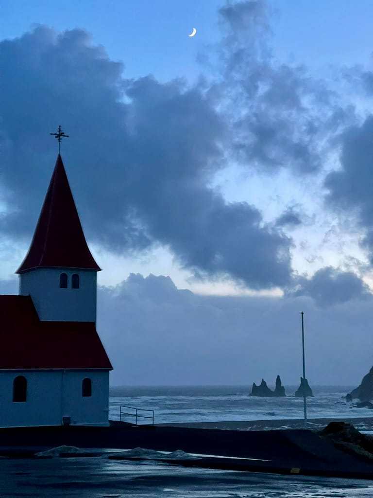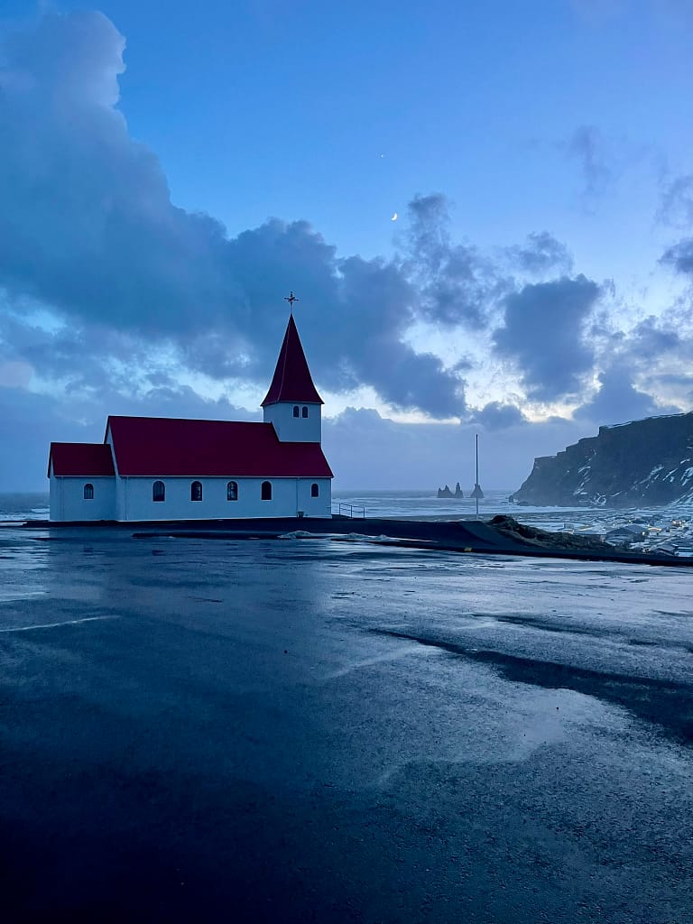 Our final stop was the charming town of Vik í Mýrdal. We barely made it before dark, just enough time to snap a photo of its picturesque church with the sea and cliffs in the background. You could also visit Reynisfjara Beach, famous for its dramatic basalt columns and powerful waves. Be careful—the "sneaky waves" here can pull you in! It's even ranked among the top 10 most beautiful non-tropical beaches in the world.